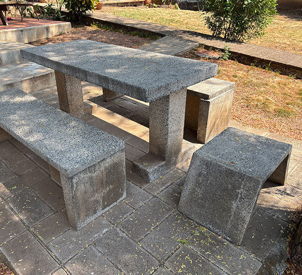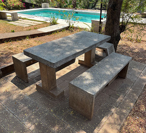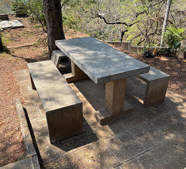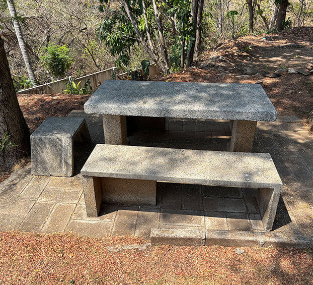Mesas y bancas de concreto.